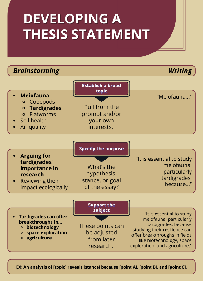 At this stage, you should have brainstormed your topic. Now, you must specify your stance and note the evidence that supports it. In short, a thesis doesn’t just describe a topic—it states what you have to say about it and how it is proved.